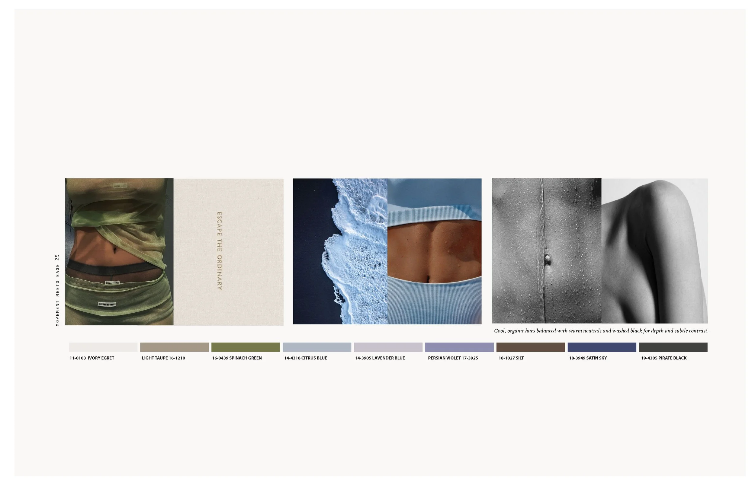 Cool, organic hues balanced with warm neutrals and washed black for depth and subtle contrast.